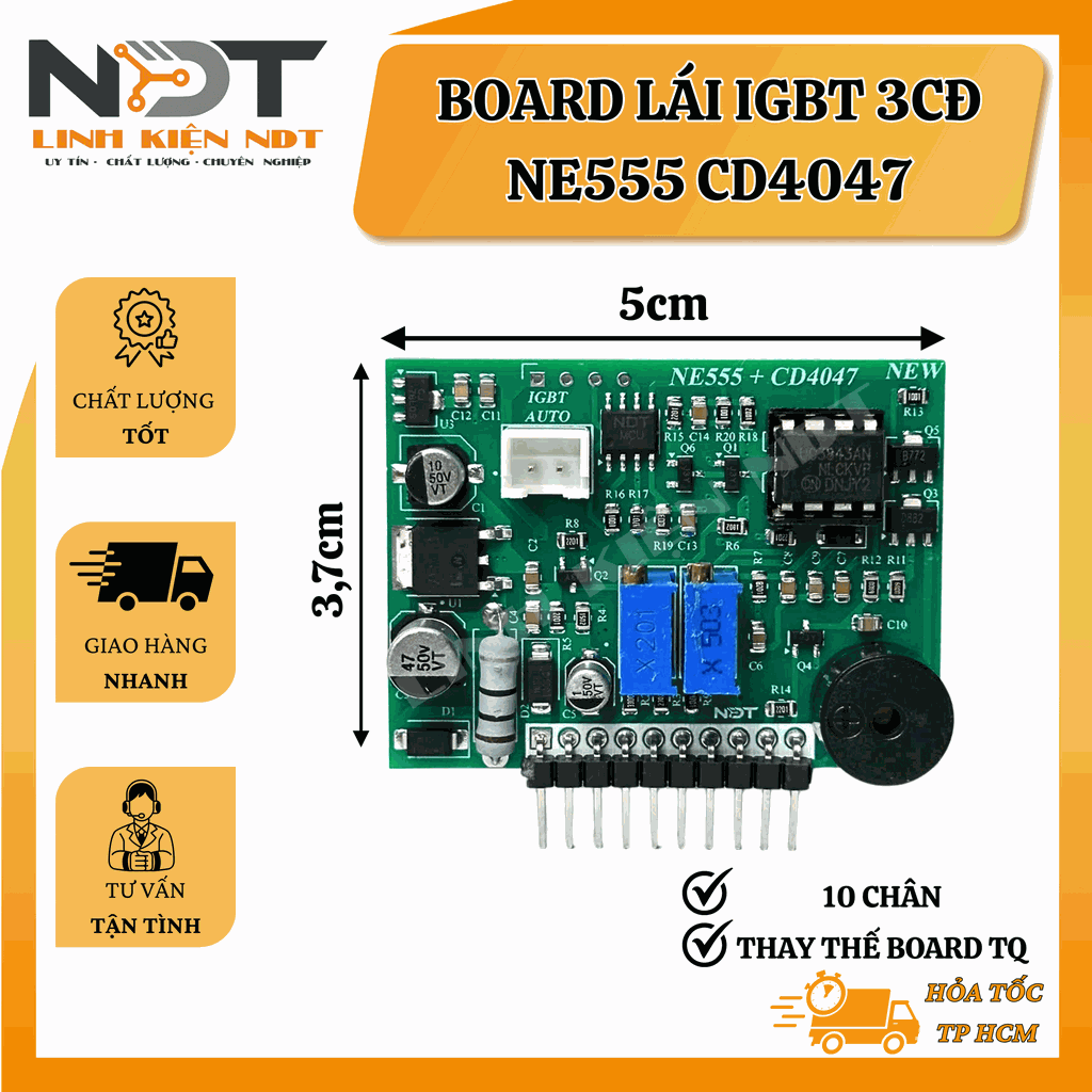Board Lái IGBT 3CĐ NE555 CD4047 là bo mạch điều khiển IGBT chuyên dụng, hỗ trợ tự động dò dòng và điều chỉnh xung phù hợp với tải, giúp tối ưu hiệu suất và bảo vệ linh kiện. Mạch tích hợp 3 chế độ hoạt động gồm: