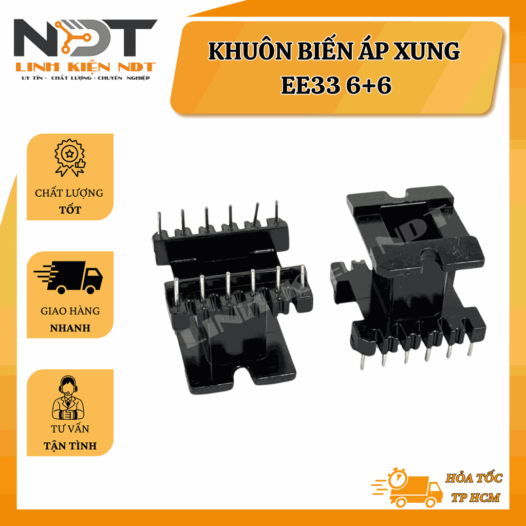 Khuôn Biến Áp Xung EE33 6+6 chân được dùng để quấn dây cho biến áp xung hoặc cuộn cảm trong các mạch nguồn xung, mạch lọc và các thiết bị điện tử công suất. Sản phẩm có kích thước tiêu chuẩn, chất liệu nhựa chịu nhiệt tốt, phù hợp cho cả sản xuất mới và thay thế.