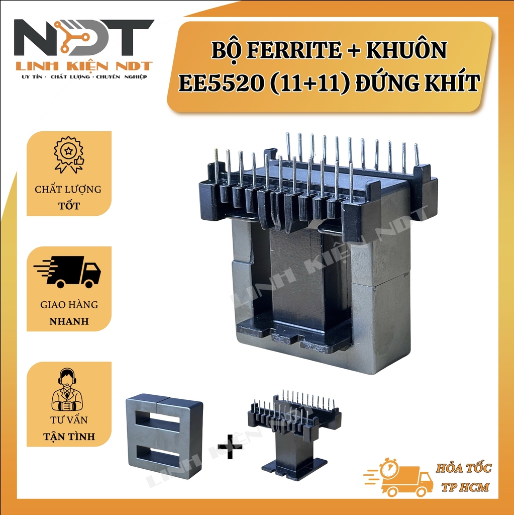 Bộ lõi biến áp xung EE5520 gồm lõi ferrite chất lượng cao và khuôn quấn dây 11+11 chân bằng nhựa chịu nhiệt, thích hợp dùng cho chế tạo biến áp nguồn xung, inverter công suất lớn, UPS, nguồn LED driver và các mạch công suất cao. Lõi ferrite EE5520 được thiết kế tổn hao thấp, hoạt động ổn định ở tần số cao, giúp nâng cao hiệu suất và tuổi thọ thiết bị.