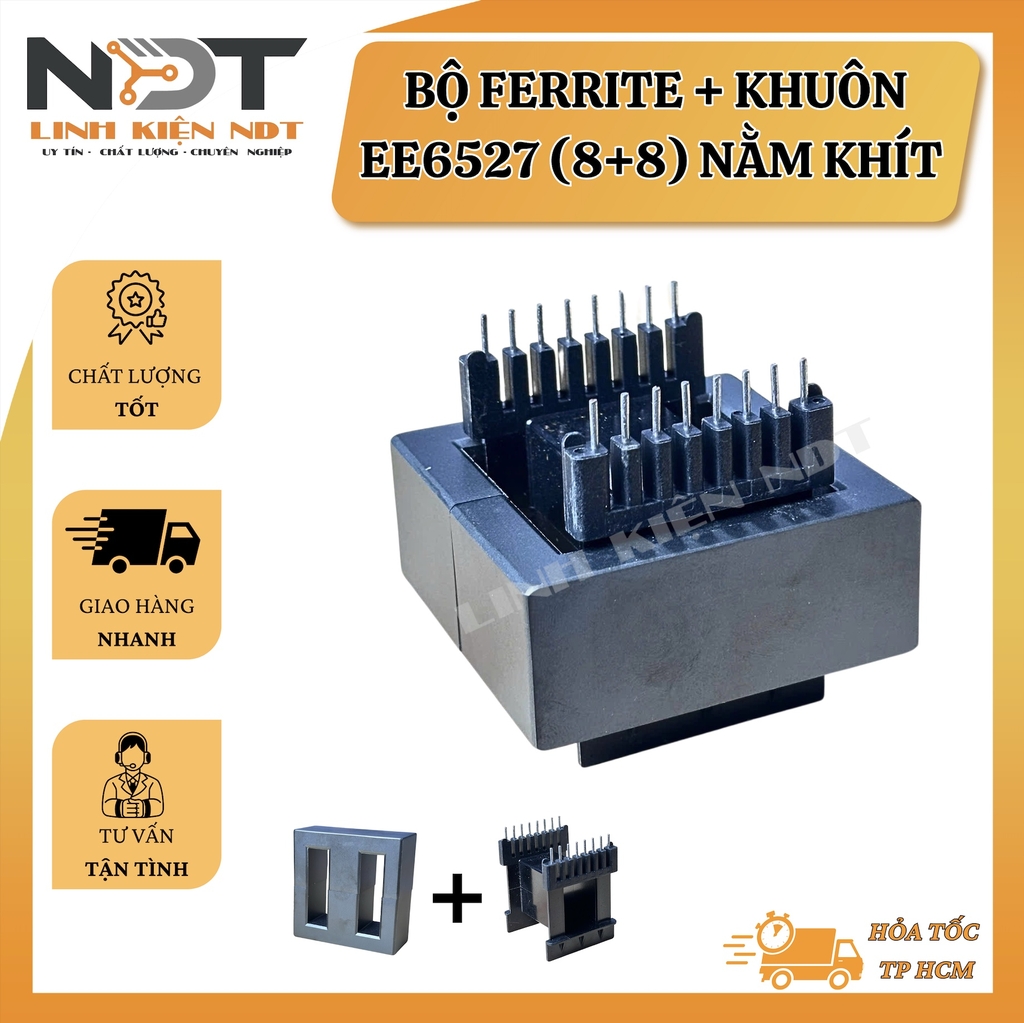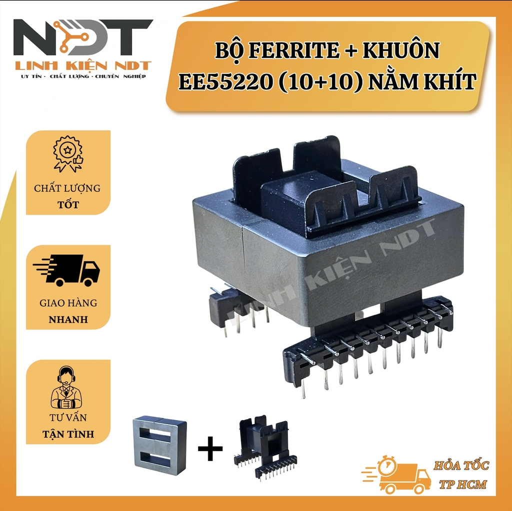 Bộ lõi biến áp xung EE5520 bao gồm lõi ferrite cao cấp và khuôn nhựa nằm 10+10 chân phù hợp chế tạo biến áp nguồn xung công suất lớn, nghịch lưu, UPS, hoặc các mạch nguồn LED driver. Lõi ferrite được sản xuất với vật liệu chất lượng cao, tổn hao thấp, làm việc ổn định ở tần số cao, giúp tối ưu hiệu suất và độ bền của thiết bị.