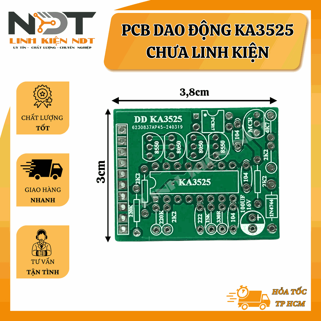 PCB dao động KA3525 là bo mạch in được thiết kế chuyên dụng cho việc lắp ráp mạch dao động dựa trên IC KA3525(tương tự SG3525), thường dùng trong các mạch inverter, kích điện, nguồn xung công suất cao. Sản phẩm chỉ bao gồm bo mạch in (chưa lắp linh kiện), thích hợp cho người dùng DIY hoặc kỹ thuật viên muốn tự chọn và lắp ráp linh kiện theo yêu cầu.
