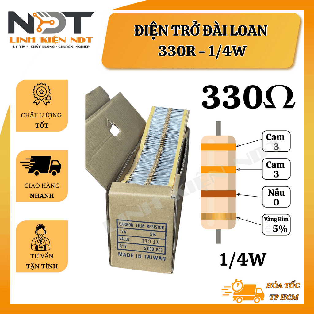 Bộ 100 điện trở 330Ω công suất 1/4W sản xuất tại Đài Loan, chất lượng ổn định, sai số thấp, chịu nhiệt tốt, thích hợp cho nhiều loại mạch điện tử dân dụng và công nghiệp. Sản phẩm đáp ứng tiêu chuẩn kỹ thuật cao, đảm bảo độ bền và độ chính xác lâu dài.