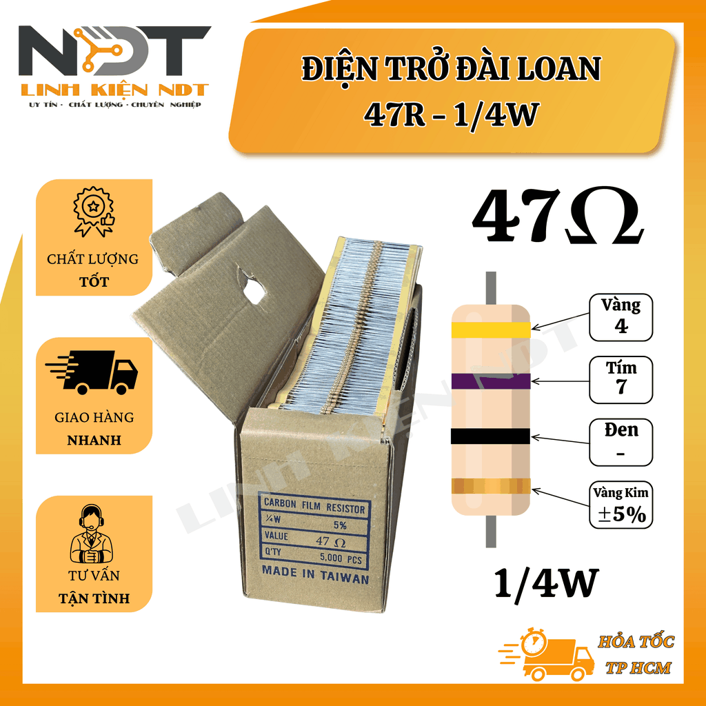 Bộ 100 điện trở 47Ω công suất 1/4W sản xuất tại Đài Loan, chất lượng ổn định, sai số thấp, phù hợp cho các mạch điện tử dân dụng và công nghiệp. Sản phẩm có khả năng chịu nhiệt tốt, hoạt động ổn định lâu dài, thích hợp cho cả nghiên cứu, học tập và sản xuất.