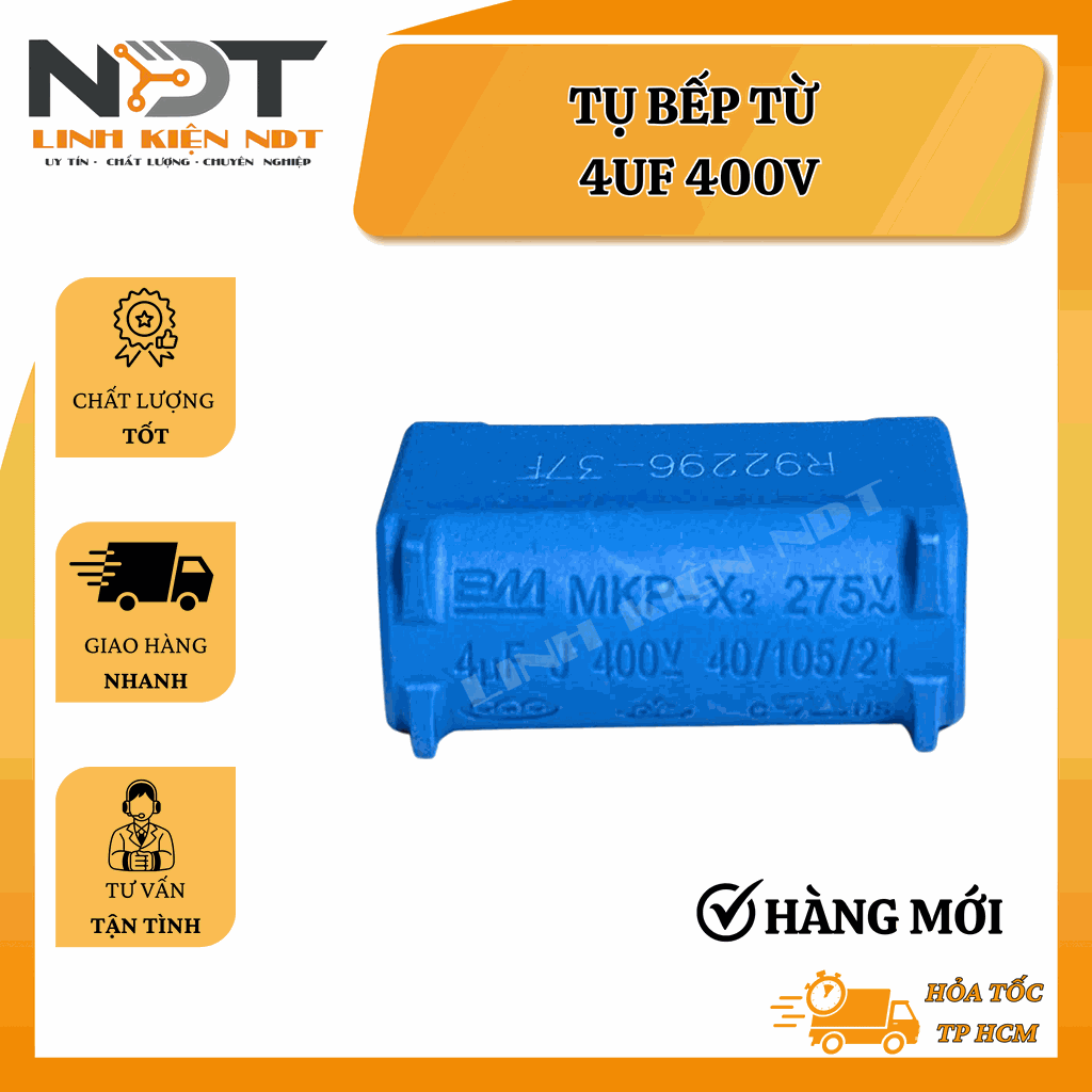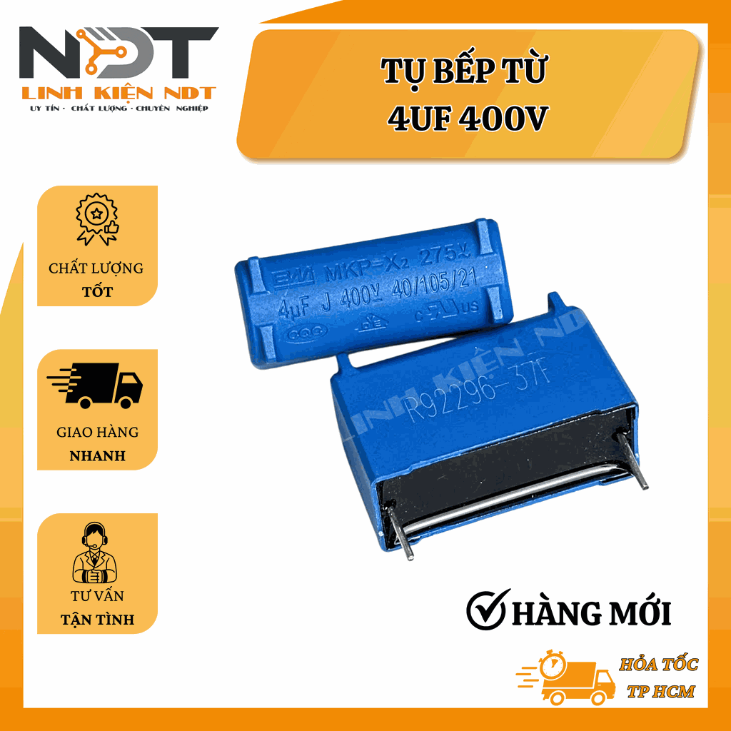 Tụ bếp từ 4µF 400V loại đứng là loại tụ film polypropylene (MKP) chuyên dùng trong mạch công suất bếp từ, quạt điện, hoặc các thiết bị điện tử yêu cầu tụ chịu nhiệt, chịu áp cao và làm việc ổn định. Thiết kế loại đứng giúp tiết kiệm không gian lắp đặt và dễ dàng thay thế.